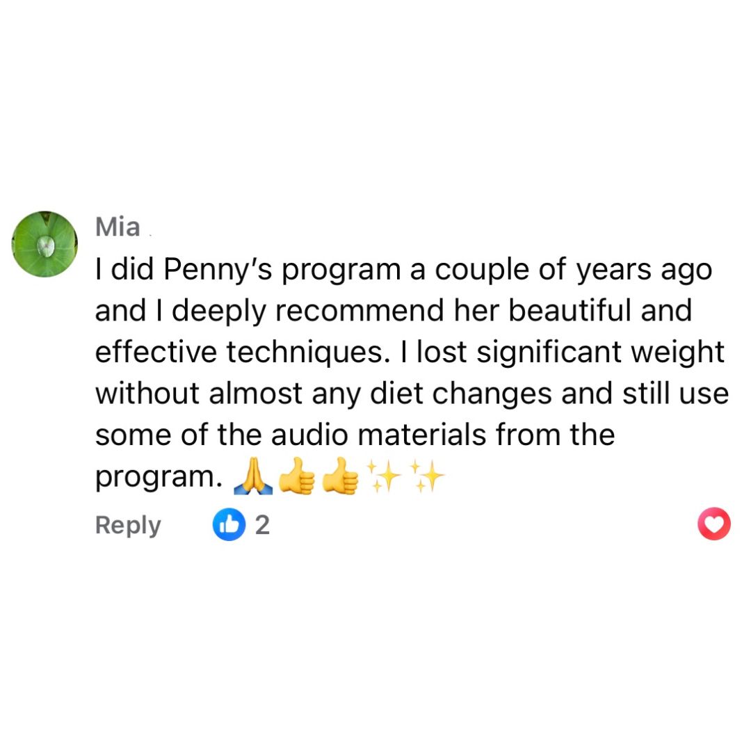 Penelope has worked 1:1 with women clients over the past 3 years to help the lose weight from the inside-out with coaching and energy healing only (no dieting, no exercise plan). So far, one woman has lost up to 35 lbs (16 kg) with this method only.